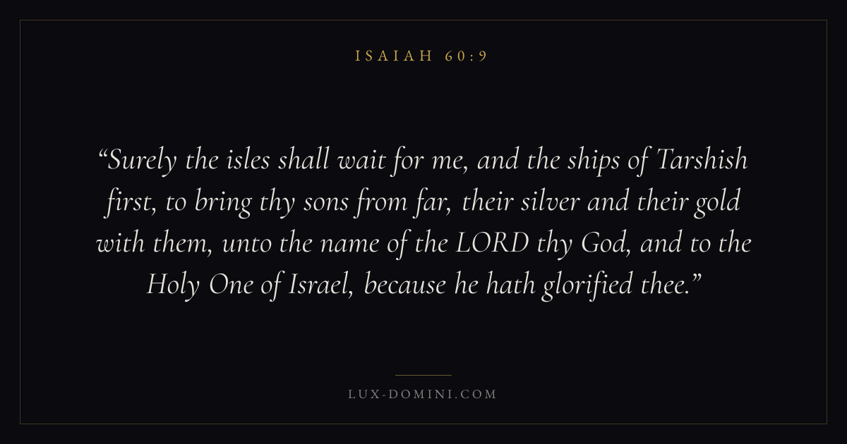 Surely the isles shall wait for me, and the ships of Tarshish first, to bring thy sons from far, their silver and their gold with them, unto the name of the LORD thy God, and to the Holy One of Israel, because he hath glorified thee.