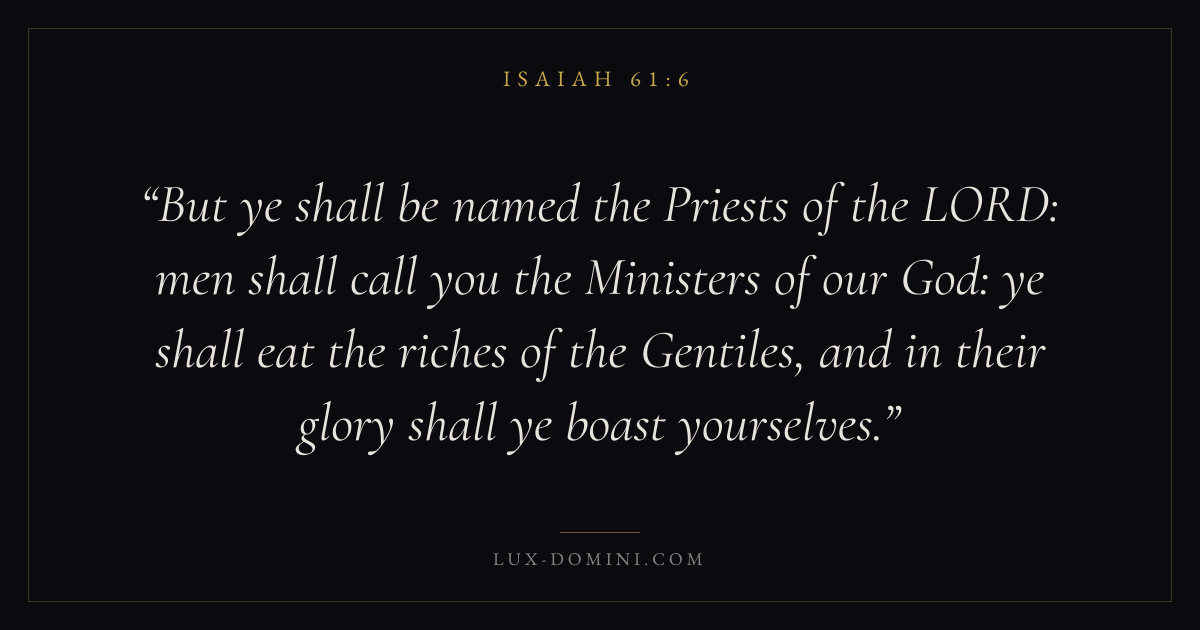But ye shall be named the Priests of the LORD: men shall call you the Ministers of our God: ye shall eat the riches of the Gentiles, and in their glory shall ye boast yourselves.