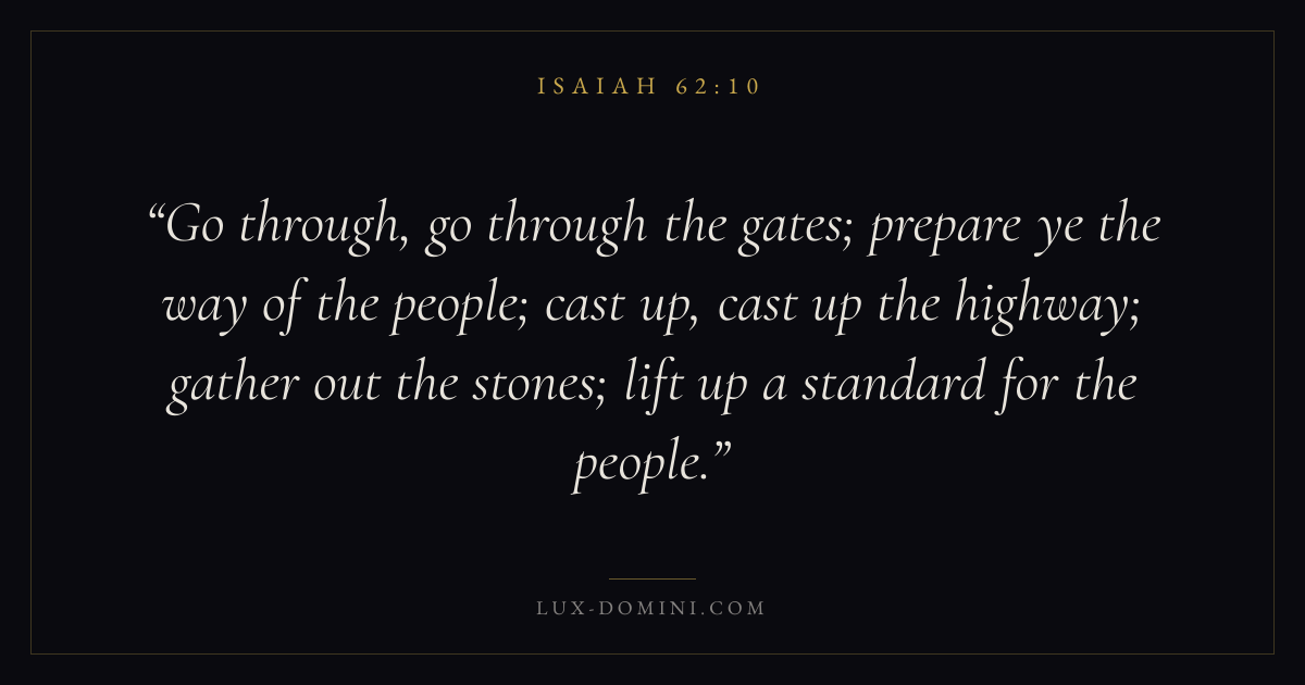 Go through, go through the gates; prepare ye the way of the people; cast up, cast up the highway; gather out the stones; lift up a standard for the people.