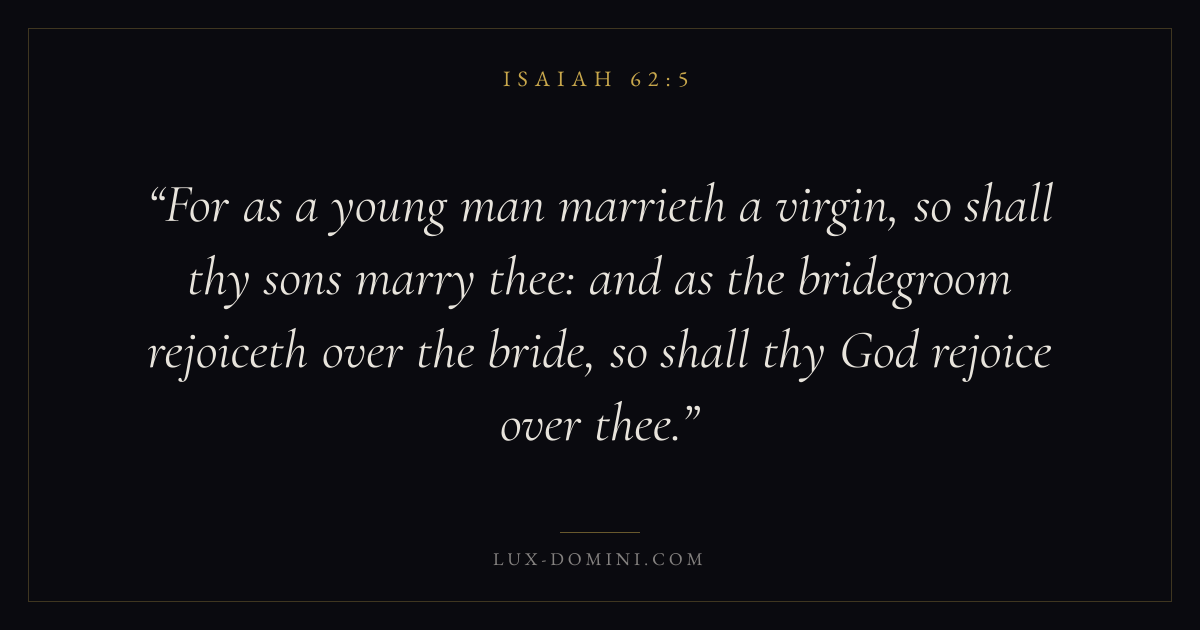 For as a young man marrieth a virgin, so shall thy sons marry thee: and as the bridegroom rejoiceth over the bride, so shall thy God rejoice over thee.