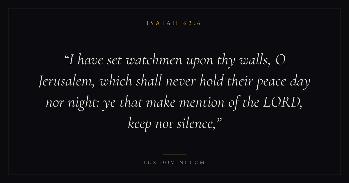 I have set watchmen upon thy walls, O Jerusalem, which shall never hold their peace day nor night: ye that make mention of the LORD, keep not silence,