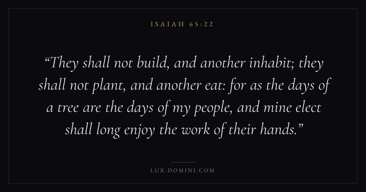 They shall not build, and another inhabit; they shall not plant, and another eat: for as the days of a tree are the days of my people, and mine elect shall long enjoy the work of their hands.