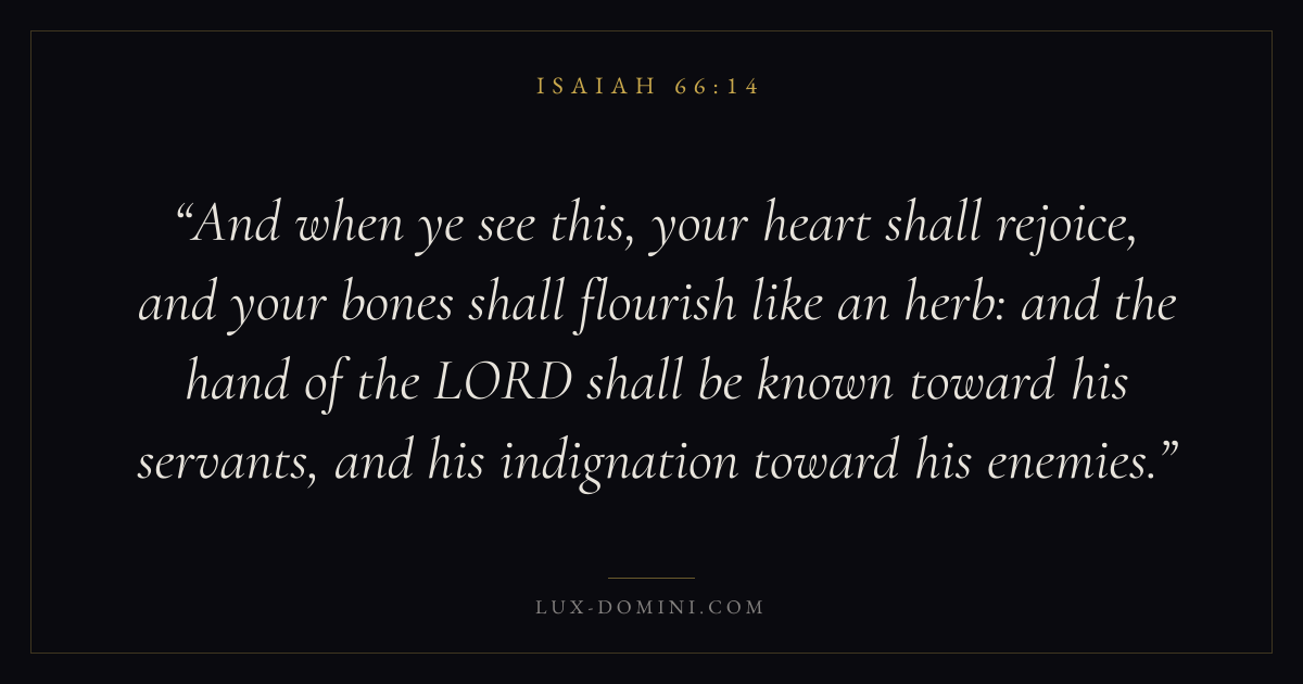 And when ye see this, your heart shall rejoice, and your bones shall flourish like an herb: and the hand of the LORD shall be known toward his servants, and his indignation toward his enemies.