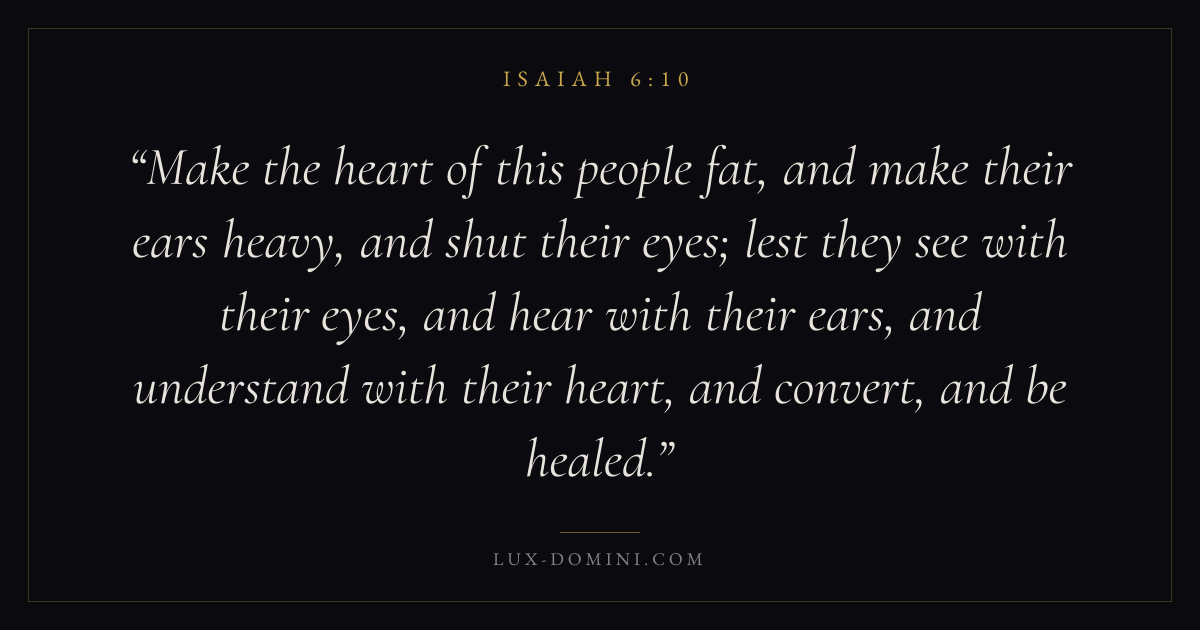 Make the heart of this people fat, and make their ears heavy, and shut their eyes; lest they see with their eyes, and hear with their ears, and understand with their heart, and convert, and be healed.