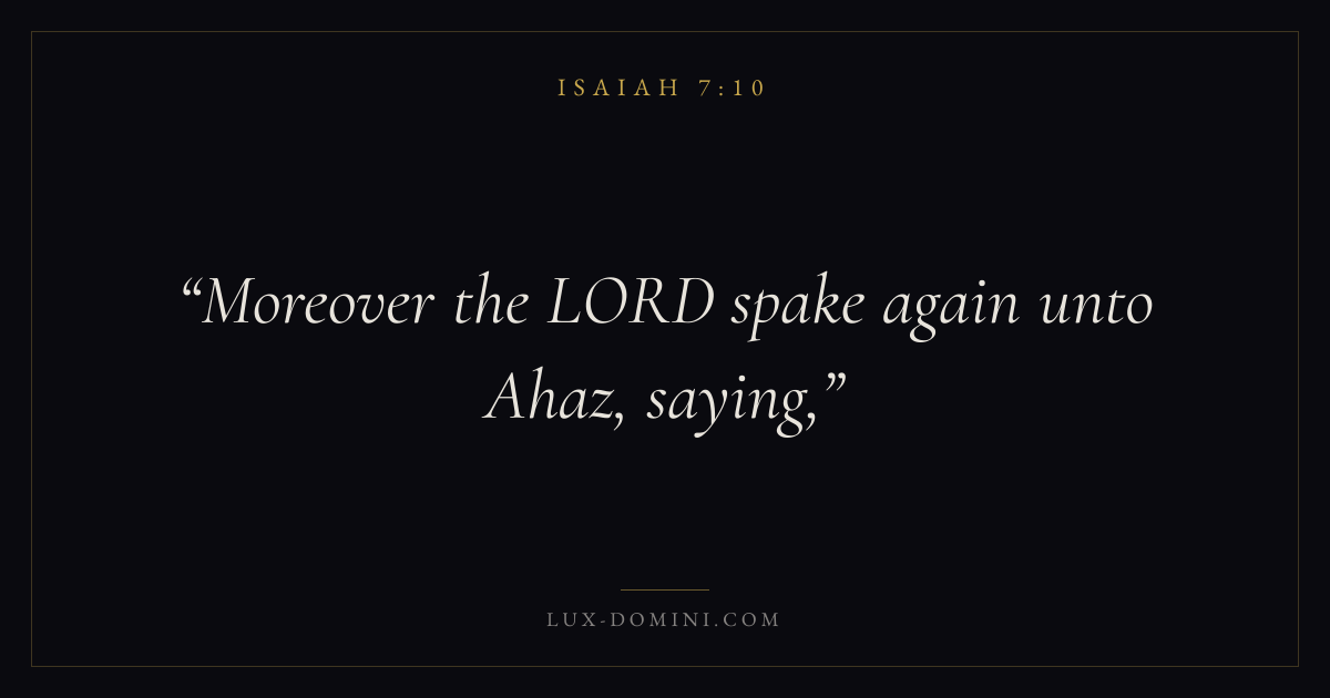 Books / Isaiah / Chapter 7 / Verse 10 ← Isaiah 7:9 Isaiah 7:10 Isaiah 7:11 → Moreover the LORD spake again unto Ahaz, saying, Download verse card Share on Twitter Share on Facebook Pin it ✦ Key themes FaithJustice and mercyHolinessJudgment Read with Isaiah 7:11Isaiah 7:12Hebrews 11:1Romans 10:17 Related topics Bible verses about faithBible verses about justice and mercy ✦ Isaiah Chapter 7 verses V. 1 V. 2 V. 3 V. 4 V. 5 V. 6 V. 7 V. 8 V. 9 V. 10 V. 11 V. 12 V. 13 V. 14 V. 15 V. 16 V. 17 V. 18 V. 19 V. 20 V. 21 V. 22 V. 23 V. 24 V. 25