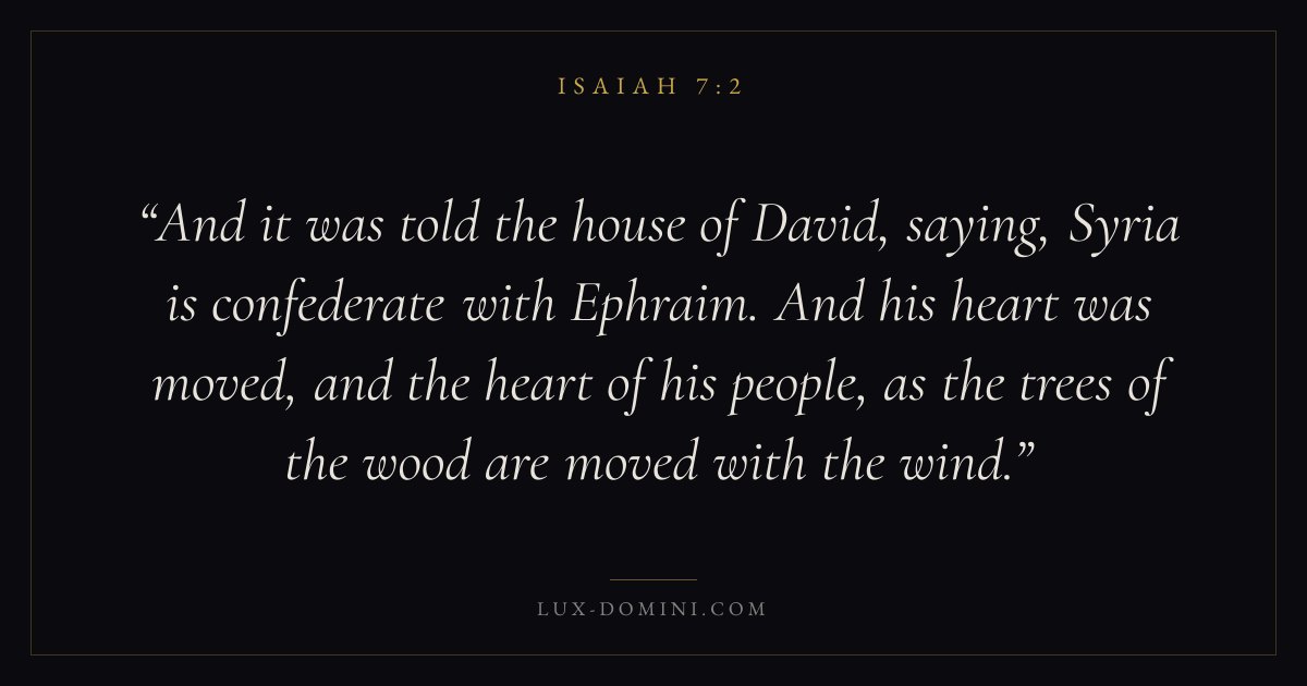 And it was told the house of David, saying, Syria is confederate with Ephraim. And his heart was moved, and the heart of his people, as the trees of the wood are moved with the wind.
