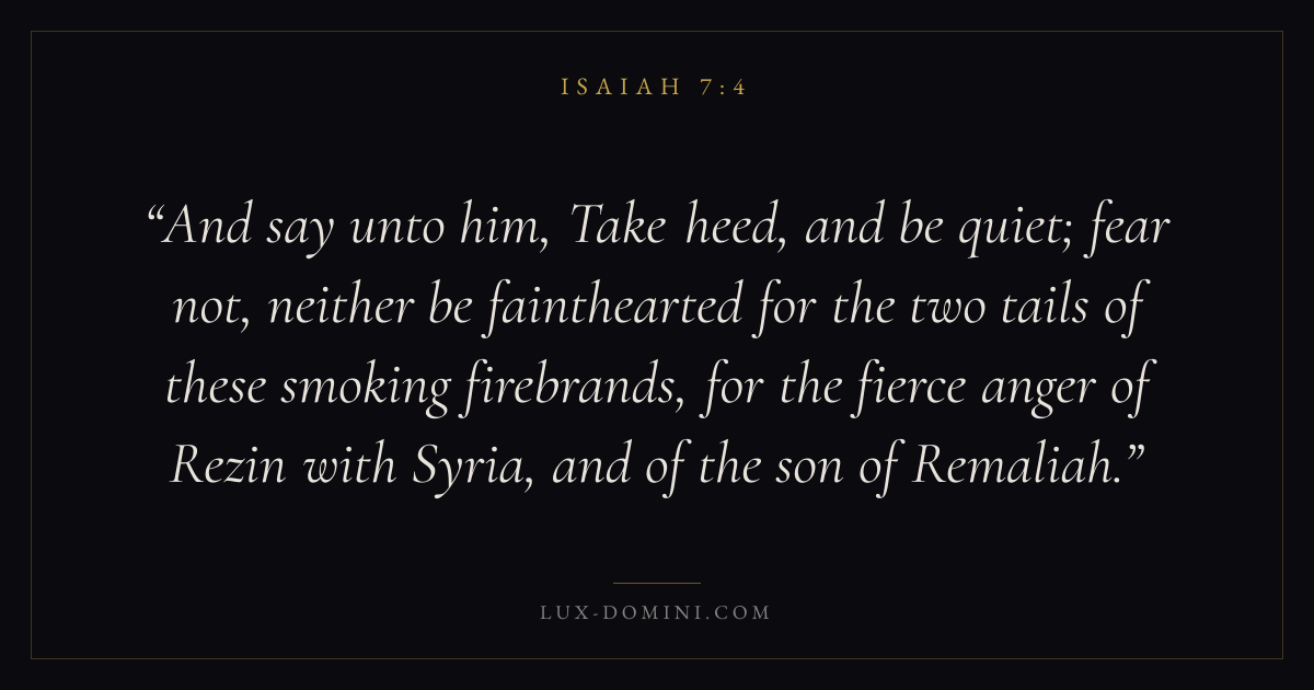 And say unto him, Take heed, and be quiet; fear not, neither be fainthearted for the two tails of these smoking firebrands, for the fierce anger of Rezin with Syria, and of the son of Remaliah.