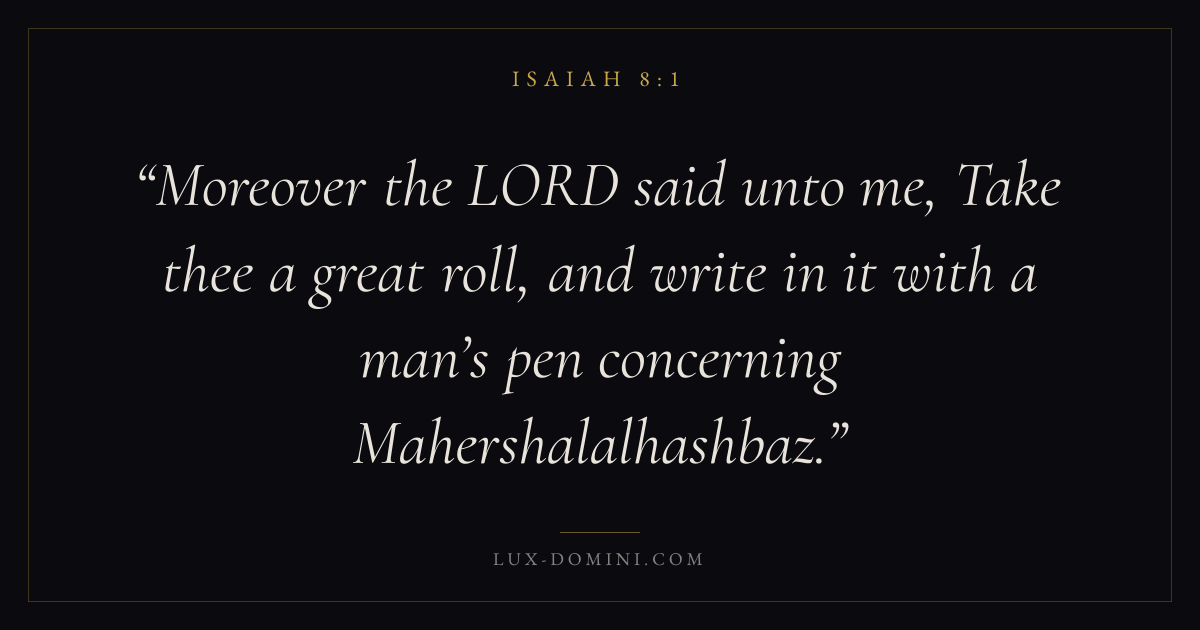 Moreover the LORD said unto me, Take thee a great roll, and write in it with a man’s pen concerning Mahershalalhashbaz.