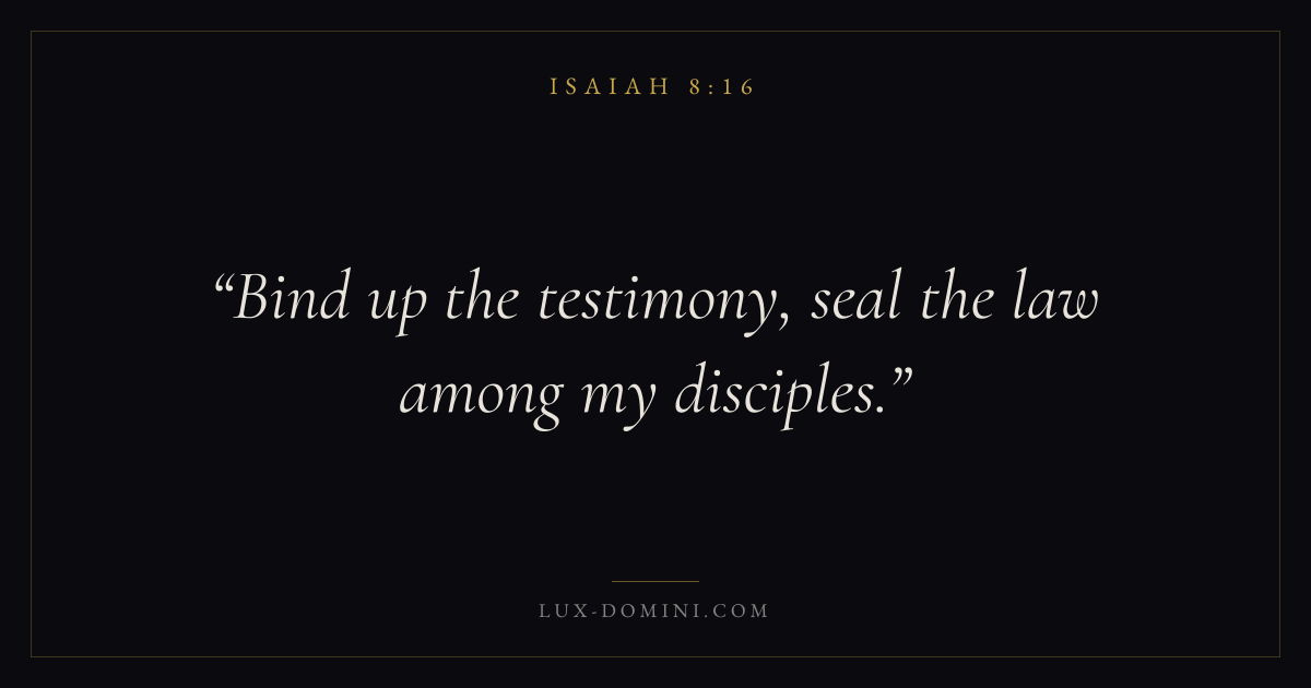 Books / Isaiah / Chapter 8 / Verse 16 ← Isaiah 8:15 Isaiah 8:16 Isaiah 8:17 → Bind up the testimony, seal the law among my disciples. Download verse card Share on Twitter Share on Facebook Pin it ✦ Key themes Justice and mercyTruthHolinessJudgment Read with Isaiah 8:17Isaiah 8:18Micah 6:8Amos 5:24 Related topics Bible verses about justice and mercyBible verses about truth ✦ Isaiah Chapter 8 verses V. 1 V. 2 V. 3 V. 4 V. 5 V. 6 V. 7 V. 8 V. 9 V. 10 V. 11 V. 12 V. 13 V. 14 V. 15 V. 16 V. 17 V. 18 V. 19 V. 20 V. 21 V. 22