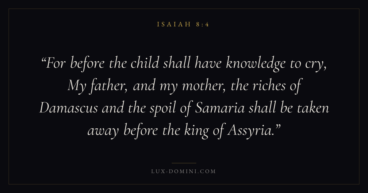 For before the child shall have knowledge to cry, My father, and my mother, the riches of Damascus and the spoil of Samaria shall be taken away before the king of Assyria.