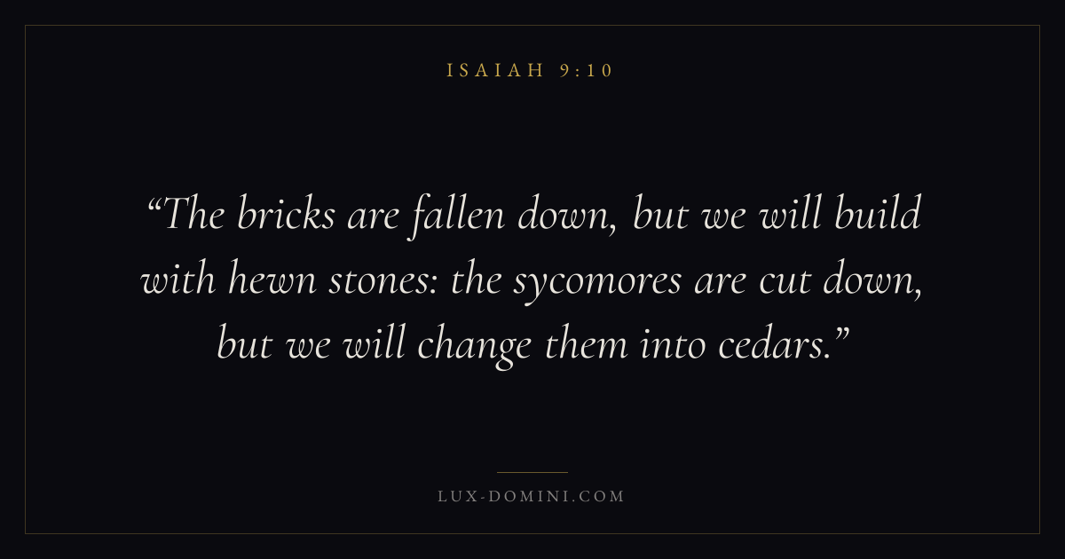 The bricks are fallen down, but we will build with hewn stones: the sycomores are cut down, but we will change them into cedars.