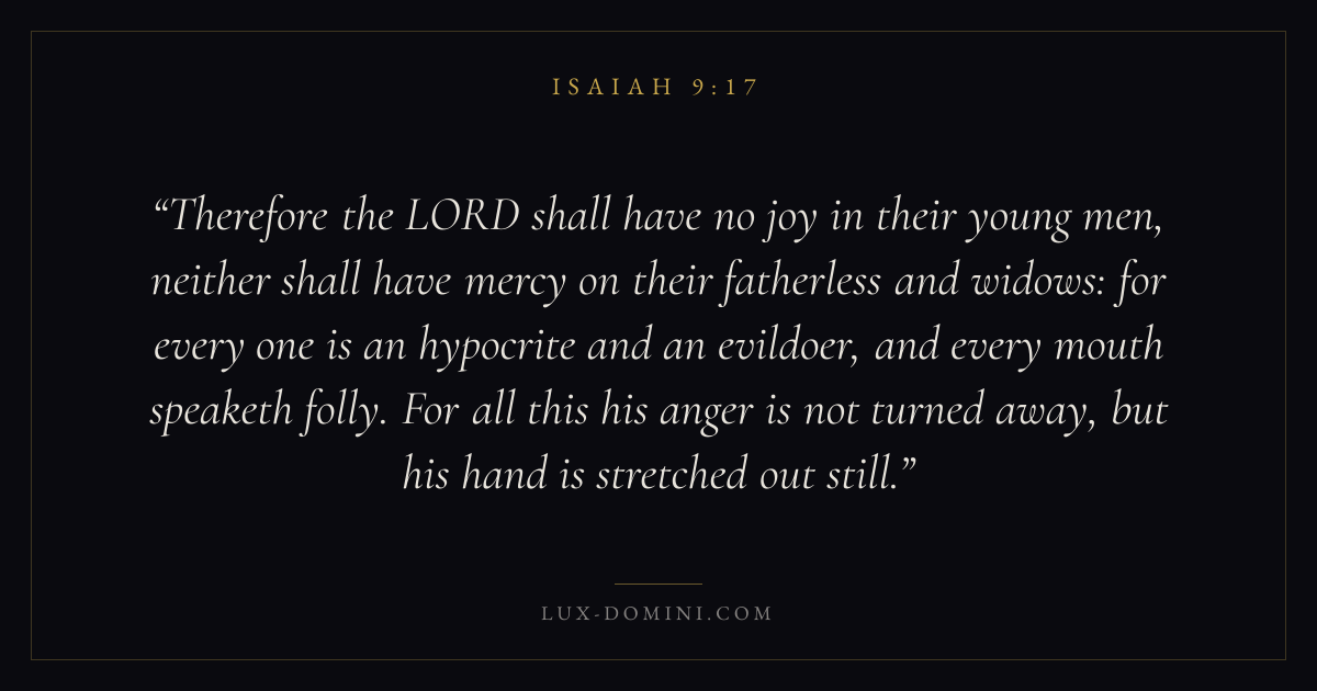 Therefore the LORD shall have no joy in their young men, neither shall have mercy on their fatherless and widows: for every one is an hypocrite and an evildoer, and every mouth speaketh folly. For all this his anger is not turned away, but his hand is stretched out still.