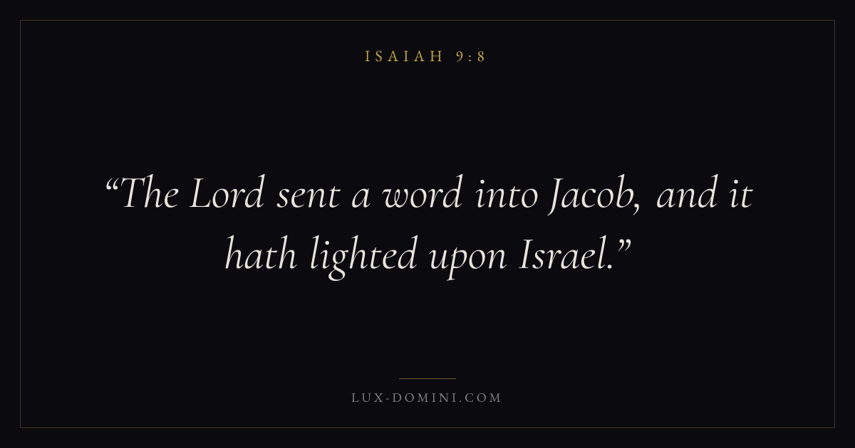 Books / Isaiah / Chapter 9 / Verse 8 ← Isaiah 9:7 Isaiah 9:8 Isaiah 9:9 → The Lord sent a word into Jacob, and it hath lighted upon Israel. Download verse card Share on Twitter Share on Facebook Pin it ✦ Key themes Justice and mercyTruthHolinessJudgment Read with Isaiah 9:9Isaiah 9:10Micah 6:8Amos 5:24 Related topics Bible verses about justice and mercyBible verses about truth ✦ Isaiah Chapter 9 verses V. 1 V. 2 V. 3 V. 4 V. 5 V. 6 V. 7 V. 8 V. 9 V. 10 V. 11 V. 12 V. 13 V. 14 V. 15 V. 16 V. 17 V. 18 V. 19 V. 20 V. 21
