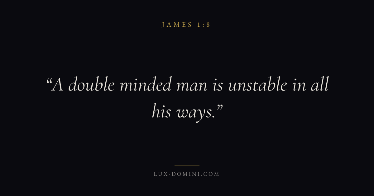 Books / James / Chapter 1 / Verse 8 ← James 1:7 James 1:8 James 1:9 → A double minded man is unstable in all his ways. Download verse card Share on Twitter Share on Facebook Pin it ✦ Key themes LoveSuffering and trialsPrayerWisdomWorks Read with James 1:5James 1:6John 3:161 Corinthians 13:4 Related topics Bible verses about loveBible verses about suffering and trialsBible verses about prayerBible verses about wisdom ✦ James Chapter 1 verses V. 1 V. 2 V. 3 V. 4 V. 5 V. 6 V. 7 V. 8 V. 9 V. 10 V. 11 V. 12 V. 13 V. 14 V. 15 V. 16 V. 17 V. 18 V. 19 V. 20 V. 21 V. 22 V. 23 V. 24 V. 25 V. 26 V. 27