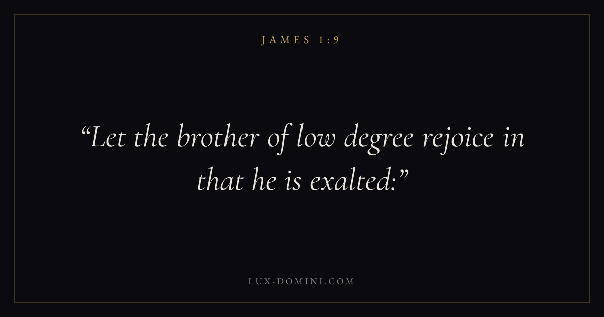 Books / James / Chapter 1 / Verse 9 ← James 1:8 James 1:9 James 1:10 → Let the brother of low degree rejoice in that he is exalted: Download verse card Share on Twitter Share on Facebook Pin it ✦ Key themes LoveSuffering and trialsPrayerWisdomWorks Read with James 1:10James 1:11John 3:161 Corinthians 13:4 Related topics Bible verses about loveBible verses about suffering and trialsBible verses about prayerBible verses about wisdom ✦ James Chapter 1 verses V. 1 V. 2 V. 3 V. 4 V. 5 V. 6 V. 7 V. 8 V. 9 V. 10 V. 11 V. 12 V. 13 V. 14 V. 15 V. 16 V. 17 V. 18 V. 19 V. 20 V. 21 V. 22 V. 23 V. 24 V. 25 V. 26 V. 27