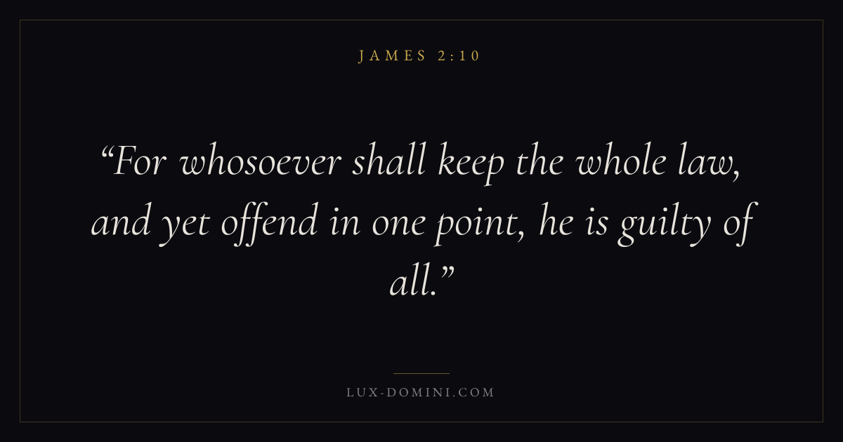 Books / James / Chapter 2 / Verse 10 ← James 2:9 James 2:10 James 2:11 → For whosoever shall keep the whole law, and yet offend in one point, he is guilty of all. Download verse card Share on Twitter Share on Facebook Pin it ✦ Key themes FaithPrayerWisdomHumilityWorks Read with James 2:8James 2:9Hebrews 11:1Romans 10:17 Related topics Bible verses about faithBible verses about prayerBible verses about wisdomBible verses about humility ✦ James Chapter 2 verses V. 1 V. 2 V. 3 V. 4 V. 5 V. 6 V. 7 V. 8 V. 9 V. 10 V. 11 V. 12 V. 13 V. 14 V. 15 V. 16 V. 17 V. 18 V. 19 V. 20 V. 21 V. 22 V. 23 V. 24 V. 25 V. 26