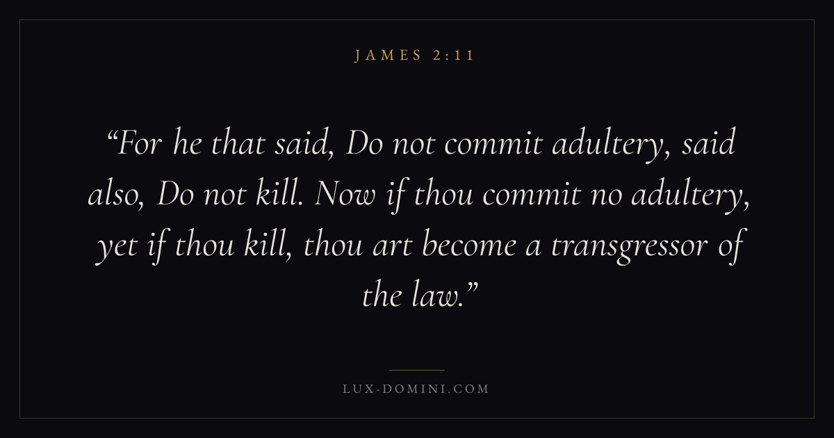 For he that said, Do not commit adultery, said also, Do not kill. Now if thou commit no adultery, yet if thou kill, thou art become a transgressor of the law.