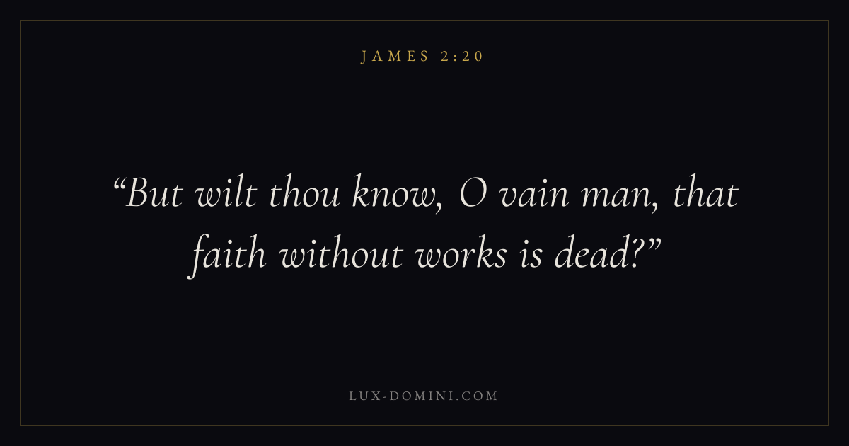 Books / James / Chapter 2 / Verse 20 ← James 2:19 James 2:20 James 2:21 → But wilt thou know, O vain man, that faith without works is dead? Download verse card Share on Twitter Share on Facebook Pin it ✦ Key themes FaithPrayerWisdomWorks Read with James 2:19James 2:21Hebrews 11:1Romans 10:17 Related topics Bible verses about faithBible verses about prayerBible verses about wisdom ✦ James Chapter 2 verses V. 1 V. 2 V. 3 V. 4 V. 5 V. 6 V. 7 V. 8 V. 9 V. 10 V. 11 V. 12 V. 13 V. 14 V. 15 V. 16 V. 17 V. 18 V. 19 V. 20 V. 21 V. 22 V. 23 V. 24 V. 25 V. 26