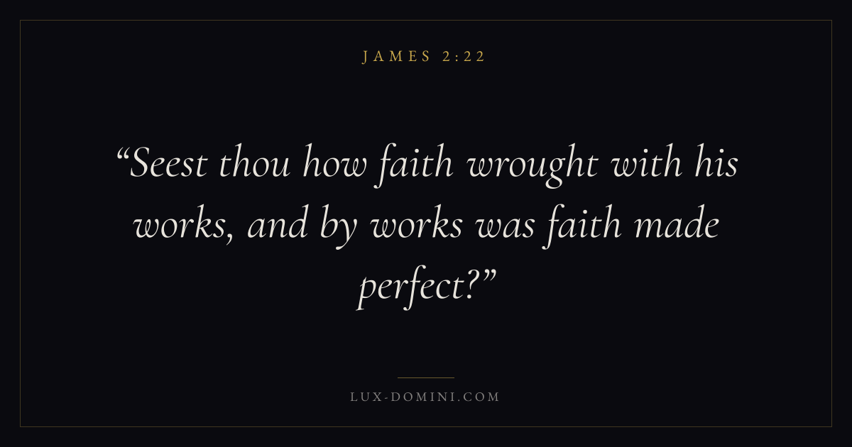 Books / James / Chapter 2 / Verse 22 ← James 2:21 James 2:22 James 2:23 → Seest thou how faith wrought with his works, and by works was faith made perfect? Download verse card Share on Twitter Share on Facebook Pin it ✦ Key themes FaithPrayerWisdomWorks Read with James 2:23James 2:24Hebrews 11:1Romans 10:17 Related topics Bible verses about faithBible verses about prayerBible verses about wisdom ✦ James Chapter 2 verses V. 1 V. 2 V. 3 V. 4 V. 5 V. 6 V. 7 V. 8 V. 9 V. 10 V. 11 V. 12 V. 13 V. 14 V. 15 V. 16 V. 17 V. 18 V. 19 V. 20 V. 21 V. 22 V. 23 V. 24 V. 25 V. 26