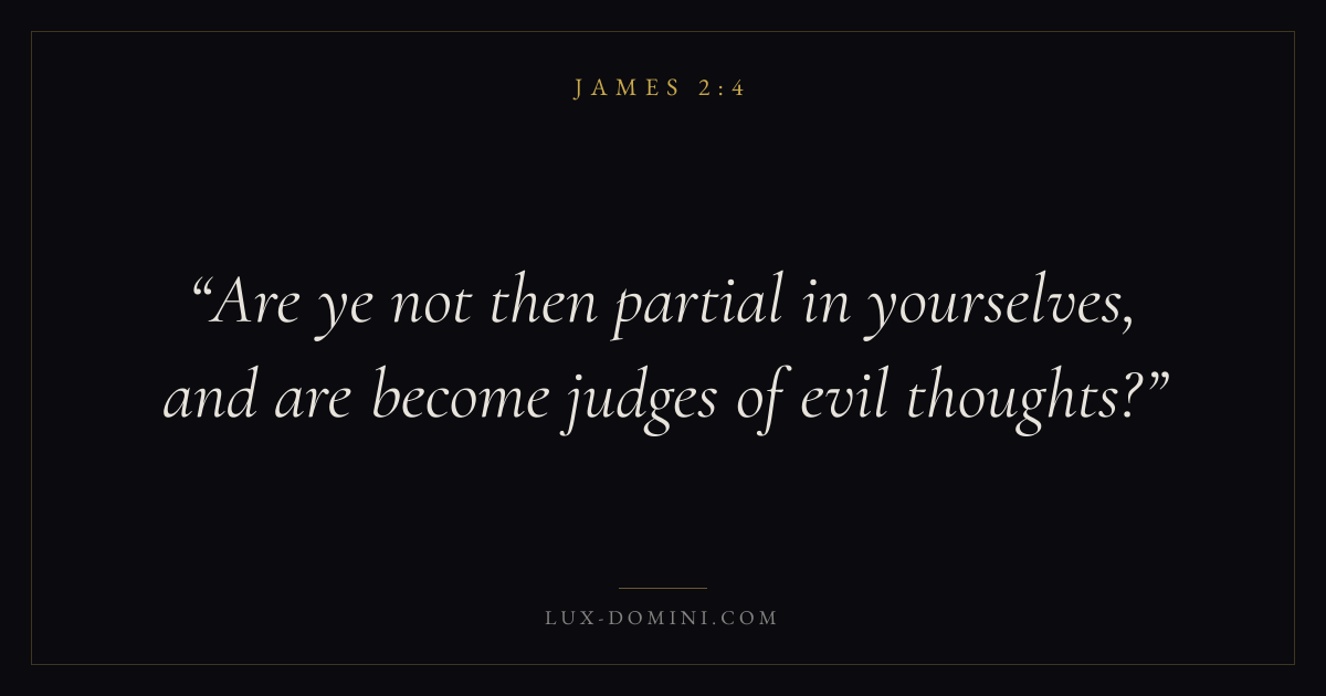 Books / James / Chapter 2 / Verse 4 ← James 2:3 James 2:4 James 2:5 → Are ye not then partial in yourselves, and are become judges of evil thoughts? Download verse card Share on Twitter Share on Facebook Pin it ✦ Key themes FaithPrayerWisdomHumilityWorks Read with James 2:1James 2:2Hebrews 11:1Romans 10:17 Related topics Bible verses about faithBible verses about prayerBible verses about wisdomBible verses about humility ✦ James Chapter 2 verses V. 1 V. 2 V. 3 V. 4 V. 5 V. 6 V. 7 V. 8 V. 9 V. 10 V. 11 V. 12 V. 13 V. 14 V. 15 V. 16 V. 17 V. 18 V. 19 V. 20 V. 21 V. 22 V. 23 V. 24 V. 25 V. 26