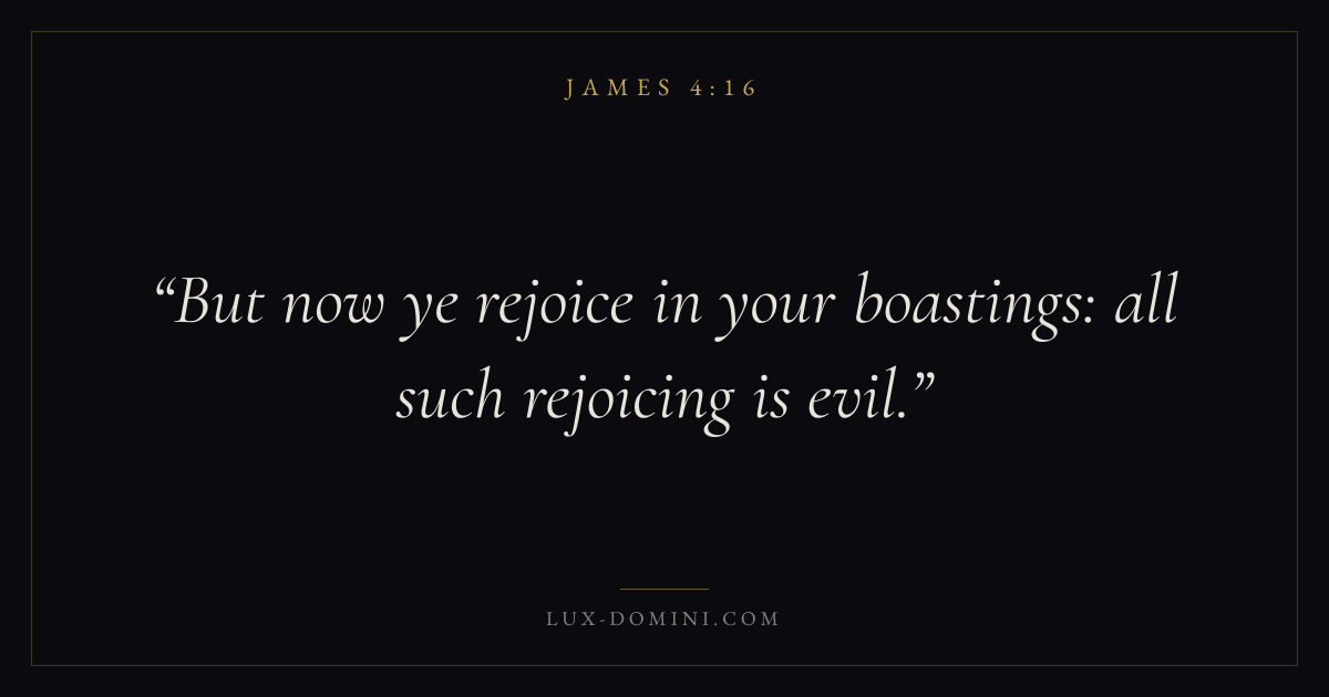 Books / James / Chapter 4 / Verse 16 ← James 4:15 James 4:16 James 4:17 → But now ye rejoice in your boastings: all such rejoicing is evil. Download verse card Share on Twitter Share on Facebook Pin it ✦ Key themes PrayerWisdomJustice and mercyTruthWorks Read with James 4:13James 4:14Matthew 6:9Luke 18:1 Related topics Bible verses about prayerBible verses about wisdomBible verses about justice and mercyBible verses about truth ✦ James Chapter 4 verses V. 1 V. 2 V. 3 V. 4 V. 5 V. 6 V. 7 V. 8 V. 9 V. 10 V. 11 V. 12 V. 13 V. 14 V. 15 V. 16 V. 17