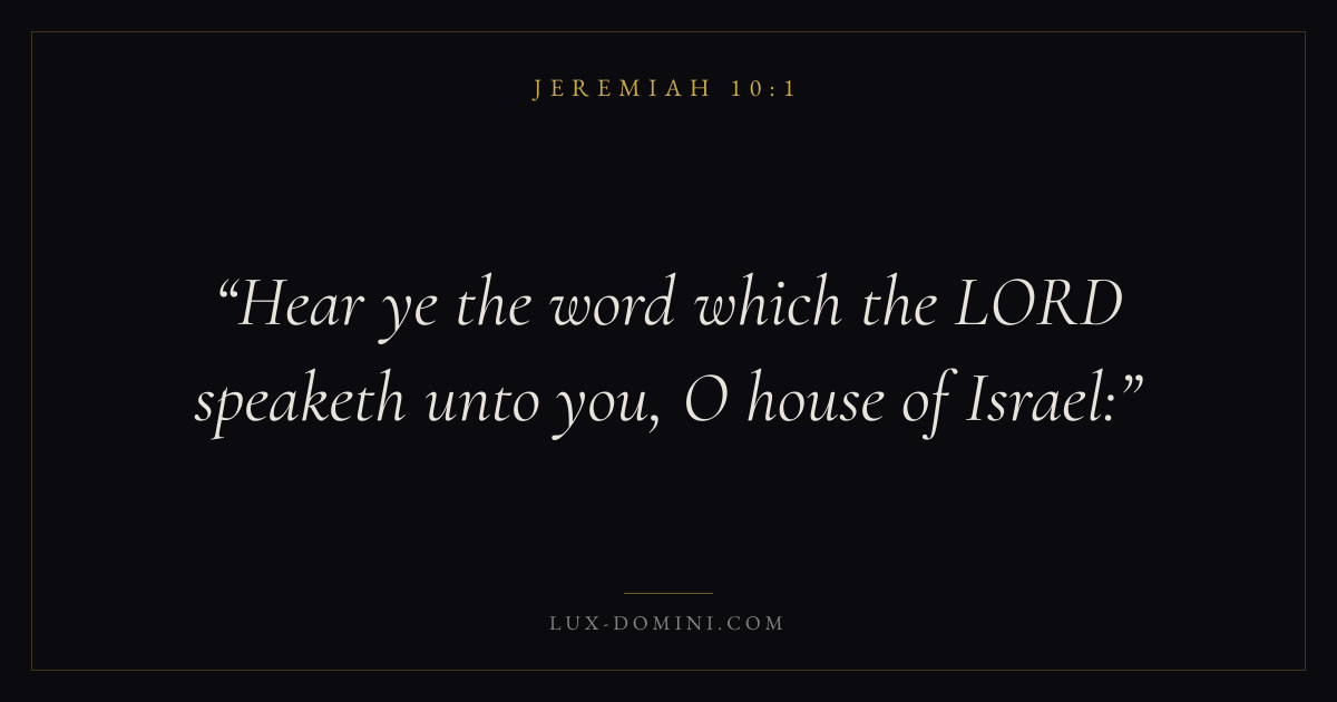 Books / Jeremiah / Chapter 10 / Verse 1 ← Jeremiah 9:26 Jeremiah 10:1 Jeremiah 10:2 → Hear ye the word which the LORD speaketh unto you, O house of Israel: Download verse card Share on Twitter Share on Facebook Pin it ✦ Key themes HopeSuffering and trialsJustice and mercyTruthJudgment Read with Jeremiah 10:2Jeremiah 10:3Romans 8:24Revelation 21:4 Related topics Bible verses about hopeBible verses about suffering and trialsBible verses about justice and mercyBible verses about truth ✦ Jeremiah Chapter 10 verses V. 1 V. 2 V. 3 V. 4 V. 5 V. 6 V. 7 V. 8 V. 9 V. 10 V. 11 V. 12 V. 13 V. 14 V. 15 V. 16 V. 17 V. 18 V. 19 V. 20 V. 21 V. 22 V. 23 V. 24 V. 25