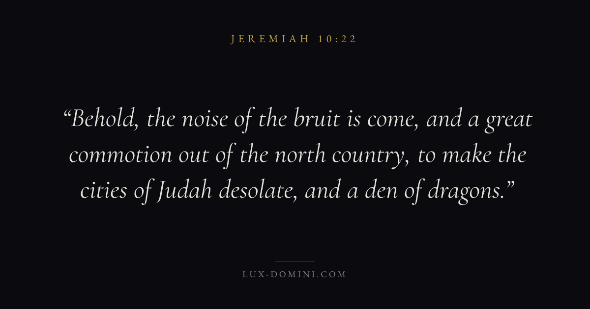 Behold, the noise of the bruit is come, and a great commotion out of the north country, to make the cities of Judah desolate, and a den of dragons.