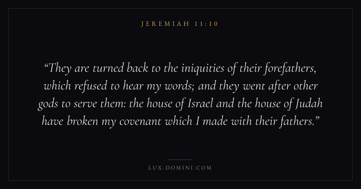They are turned back to the iniquities of their forefathers, which refused to hear my words; and they went after other gods to serve them: the house of Israel and the house of Judah have broken my covenant which I made with their fathers.