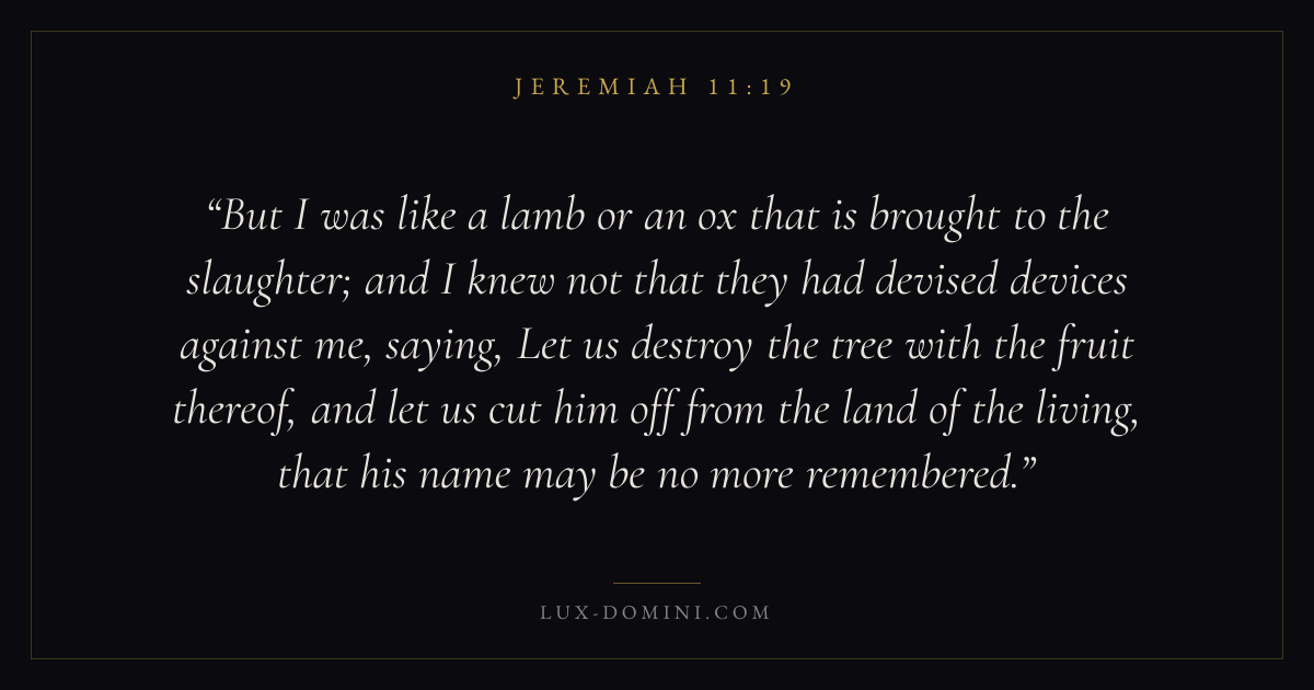 But I was like a lamb or an ox that is brought to the slaughter; and I knew not that they had devised devices against me, saying, Let us destroy the tree with the fruit thereof, and let us cut him off from the land of the living, that his name may be no more remembered.