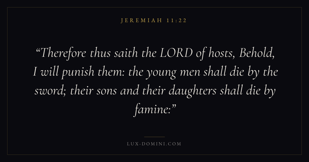 Therefore thus saith the LORD of hosts, Behold, I will punish them: the young men shall die by the sword; their sons and their daughters shall die by famine:
