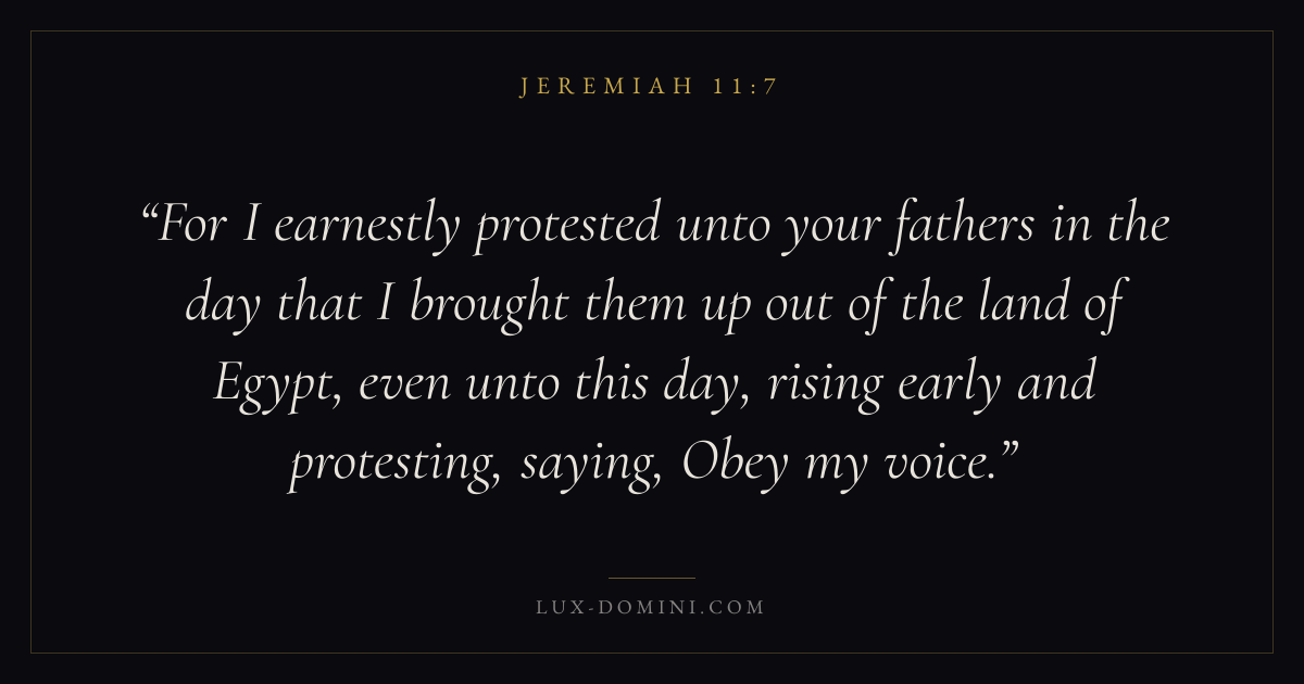 For I earnestly protested unto your fathers in the day that I brought them up out of the land of Egypt, even unto this day, rising early and protesting, saying, Obey my voice.