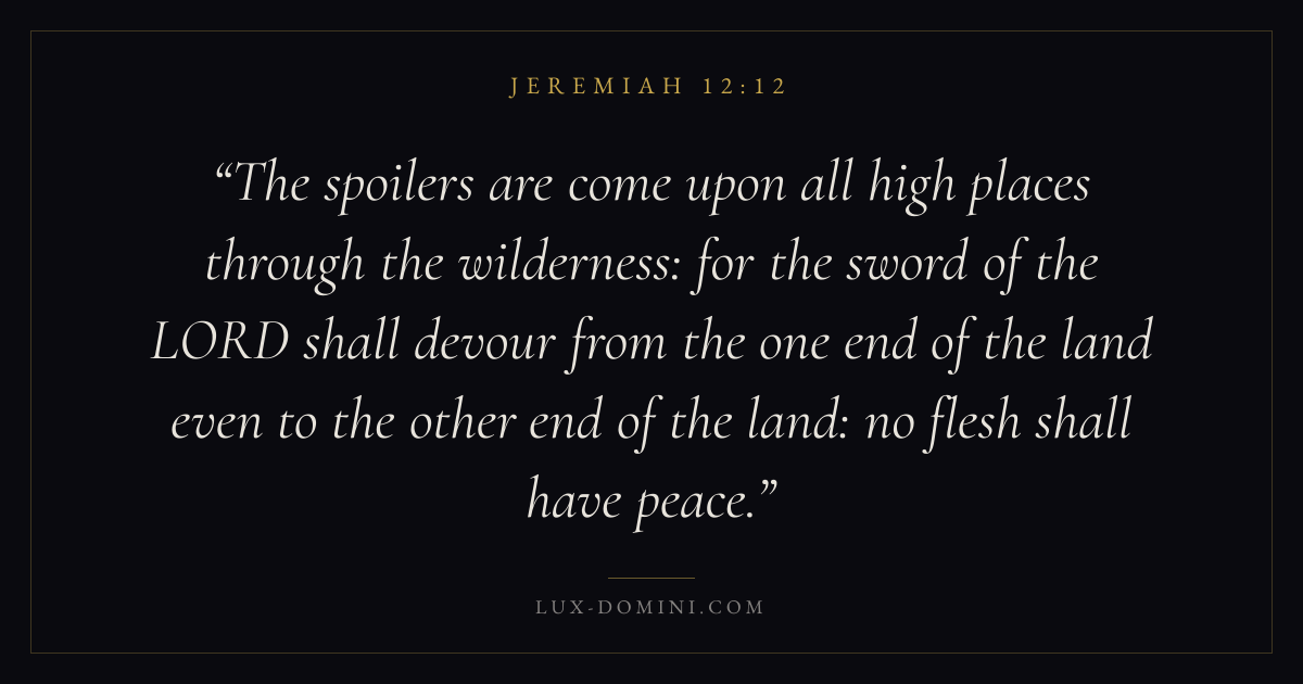 The spoilers are come upon all high places through the wilderness: for the sword of the LORD shall devour from the one end of the land even to the other end of the land: no flesh shall have peace.