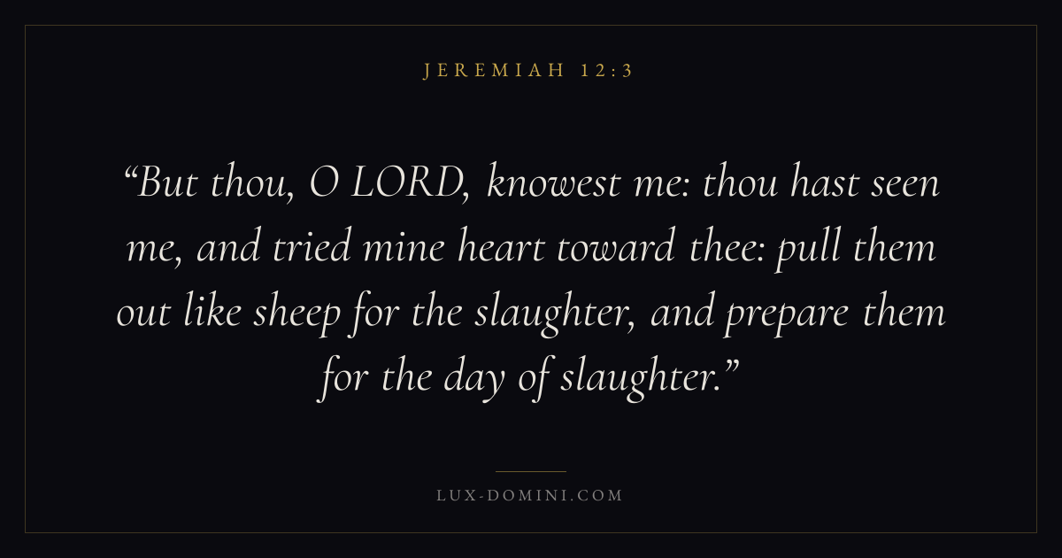 But thou, O LORD, knowest me: thou hast seen me, and tried mine heart toward thee: pull them out like sheep for the slaughter, and prepare them for the day of slaughter.