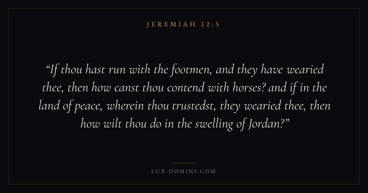 If thou hast run with the footmen, and they have wearied thee, then how canst thou contend with horses? and if in the land of peace, wherein thou trustedst, they wearied thee, then how wilt thou do in the swelling of Jordan?