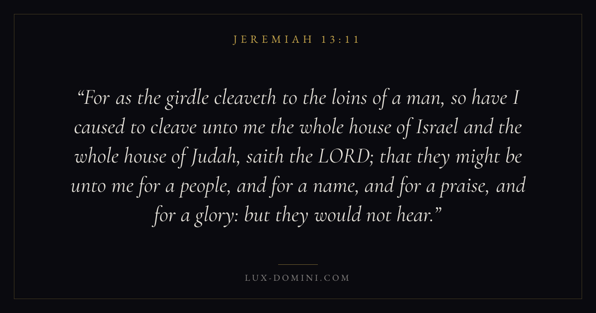 For as the girdle cleaveth to the loins of a man, so have I caused to cleave unto me the whole house of Israel and the whole house of Judah, saith the LORD; that they might be unto me for a people, and for a name, and for a praise, and for a glory: but they would not hear.