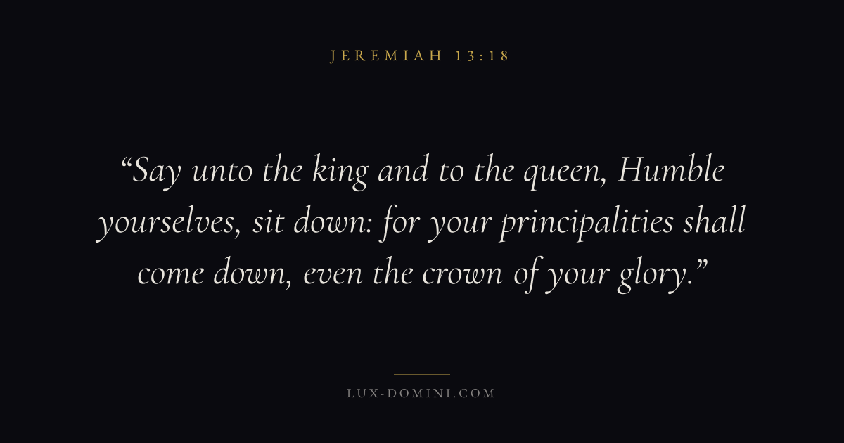 Say unto the king and to the queen, Humble yourselves, sit down: for your principalities shall come down, even the crown of your glory.