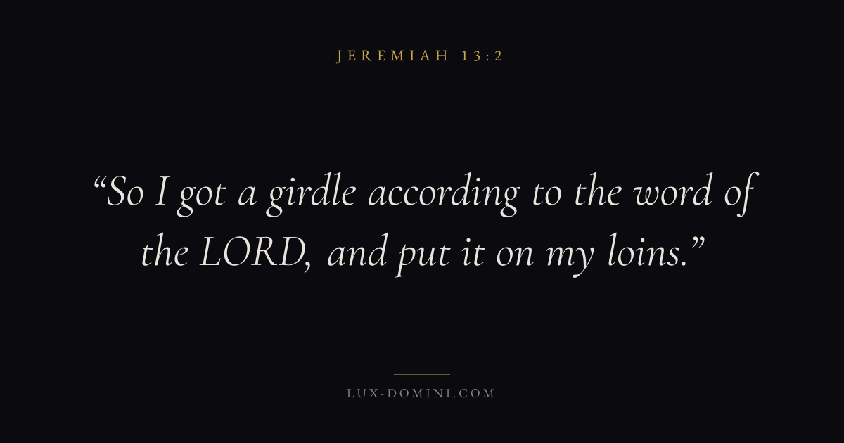 Books / Jeremiah / Chapter 13 / Verse 2 ← Jeremiah 13:1 Jeremiah 13:2 Jeremiah 13:3 → So I got a girdle according to the word of the LORD, and put it on my loins. Download verse card Share on Twitter Share on Facebook Pin it ✦ Key themes HopeSuffering and trialsJustice and mercyTruthJudgment Read with Jeremiah 13:1Jeremiah 13:3Romans 8:24Revelation 21:4 Related topics Bible verses about hopeBible verses about suffering and trialsBible verses about justice and mercyBible verses about truth ✦ Jeremiah Chapter 13 verses V. 1 V. 2 V. 3 V. 4 V. 5 V. 6 V. 7 V. 8 V. 9 V. 10 V. 11 V. 12 V. 13 V. 14 V. 15 V. 16 V. 17 V. 18 V. 19 V. 20 V. 21 V. 22 V. 23 V. 24 V. 25 V. 26 V. 27