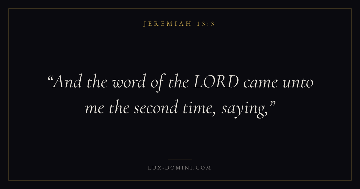 Books / Jeremiah / Chapter 13 / Verse 3 ← Jeremiah 13:2 Jeremiah 13:3 Jeremiah 13:4 → And the word of the LORD came unto me the second time, saying, Download verse card Share on Twitter Share on Facebook Pin it ✦ Key themes HopeSuffering and trialsJustice and mercyTruthJudgment Read with Jeremiah 13:1Jeremiah 13:2Romans 8:24Revelation 21:4 Related topics Bible verses about hopeBible verses about suffering and trialsBible verses about justice and mercyBible verses about truth ✦ Jeremiah Chapter 13 verses V. 1 V. 2 V. 3 V. 4 V. 5 V. 6 V. 7 V. 8 V. 9 V. 10 V. 11 V. 12 V. 13 V. 14 V. 15 V. 16 V. 17 V. 18 V. 19 V. 20 V. 21 V. 22 V. 23 V. 24 V. 25 V. 26 V. 27