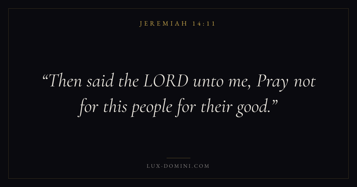 Books / Jeremiah / Chapter 14 / Verse 11 ← Jeremiah 14:10 Jeremiah 14:11 Jeremiah 14:12 → Then said the LORD unto me, Pray not for this people for their good. Download verse card Share on Twitter Share on Facebook Pin it ✦ Key themes HopeSuffering and trialsPrayerJustice and mercyJudgment Read with Jeremiah 14:10Jeremiah 14:12Romans 8:24Revelation 21:4 Related topics Bible verses about hopeBible verses about suffering and trialsBible verses about prayerBible verses about justice and mercy ✦ Jeremiah Chapter 14 verses V. 1 V. 2 V. 3 V. 4 V. 5 V. 6 V. 7 V. 8 V. 9 V. 10 V. 11 V. 12 V. 13 V. 14 V. 15 V. 16 V. 17 V. 18 V. 19 V. 20 V. 21 V. 22