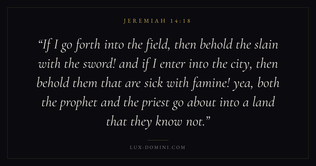 If I go forth into the field, then behold the slain with the sword! and if I enter into the city, then behold them that are sick with famine! yea, both the prophet and the priest go about into a land that they know not.