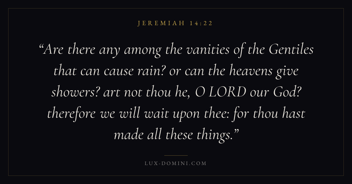 Are there any among the vanities of the Gentiles that can cause rain? or can the heavens give showers? art not thou he, O LORD our God? therefore we will wait upon thee: for thou hast made all these things.