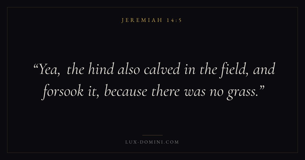 Books / Jeremiah / Chapter 14 / Verse 5 ← Jeremiah 14:4 Jeremiah 14:5 Jeremiah 14:6 → Yea, the hind also calved in the field, and forsook it, because there was no grass. Download verse card Share on Twitter Share on Facebook Pin it ✦ Key themes HopeSuffering and trialsPrayerJustice and mercyJudgment Read with Jeremiah 14:4Jeremiah 14:6Romans 8:24Revelation 21:4 Related topics Bible verses about hopeBible verses about suffering and trialsBible verses about prayerBible verses about justice and mercy ✦ Jeremiah Chapter 14 verses V. 1 V. 2 V. 3 V. 4 V. 5 V. 6 V. 7 V. 8 V. 9 V. 10 V. 11 V. 12 V. 13 V. 14 V. 15 V. 16 V. 17 V. 18 V. 19 V. 20 V. 21 V. 22