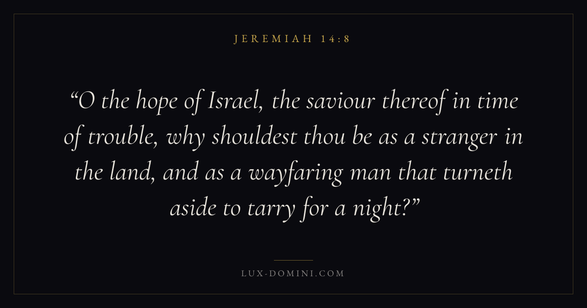 O the hope of Israel, the saviour thereof in time of trouble, why shouldest thou be as a stranger in the land, and as a wayfaring man that turneth aside to tarry for a night?