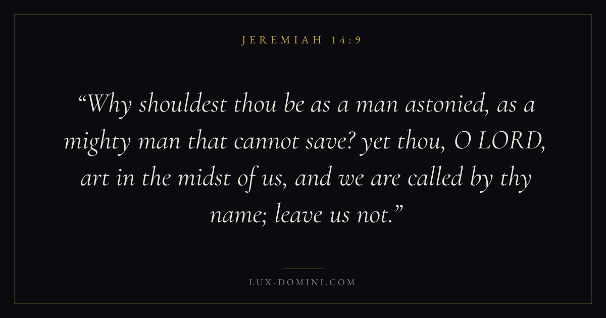 Why shouldest thou be as a man astonied, as a mighty man that cannot save? yet thou, O LORD, art in the midst of us, and we are called by thy name; leave us not.
