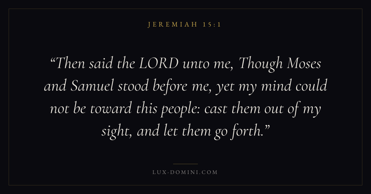 Then said the LORD unto me, Though Moses and Samuel stood before me, yet my mind could not be toward this people: cast them out of my sight, and let them go forth.