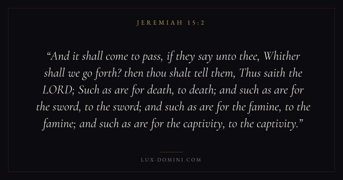 And it shall come to pass, if they say unto thee, Whither shall we go forth? then thou shalt tell them, Thus saith the LORD; Such as are for death, to death; and such as are for the sword, to the sword; and such as are for the famine, to the famine; and such as are for the captivity, to the captivity.