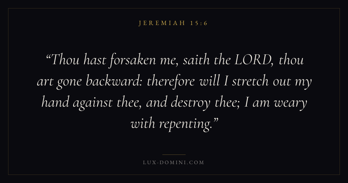 Thou hast forsaken me, saith the LORD, thou art gone backward: therefore will I stretch out my hand against thee, and destroy thee; I am weary with repenting.