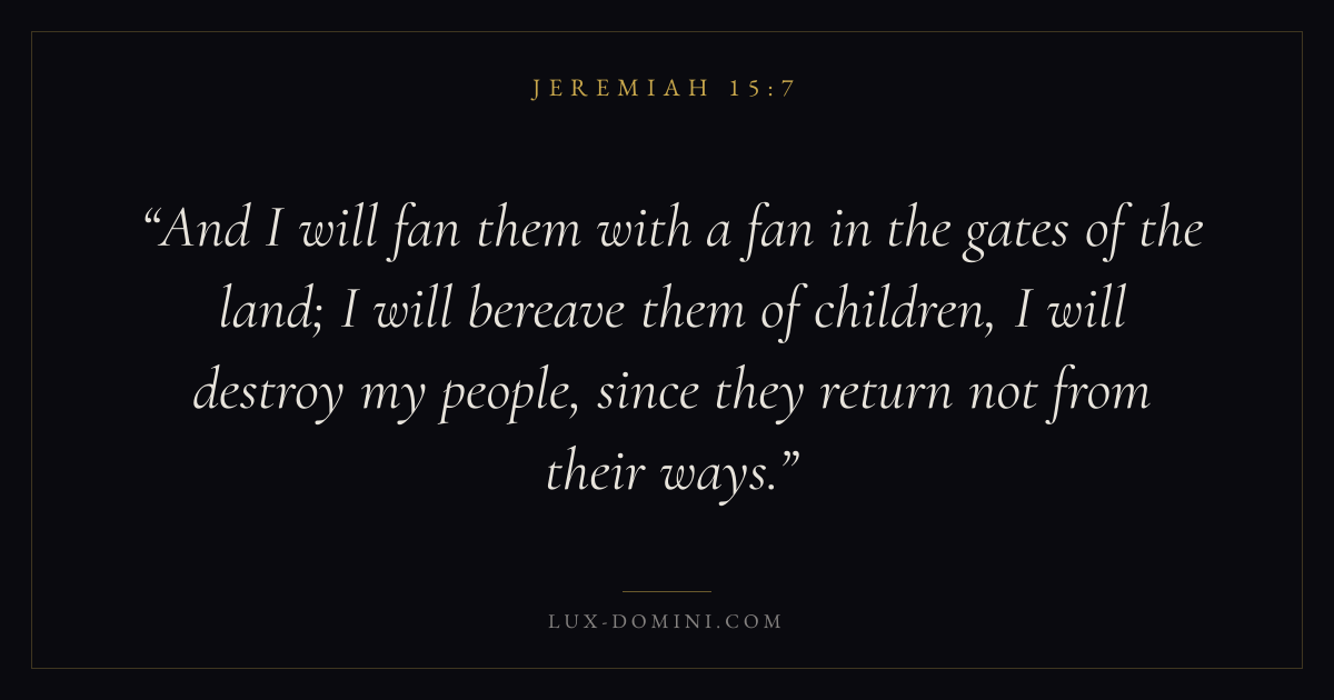 And I will fan them with a fan in the gates of the land; I will bereave them of children, I will destroy my people, since they return not from their ways.