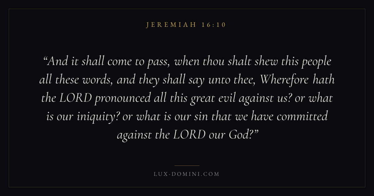 And it shall come to pass, when thou shalt shew this people all these words, and they shall say unto thee, Wherefore hath the LORD pronounced all this great evil against us? or what is our iniquity? or what is our sin that we have committed against the LORD our God?