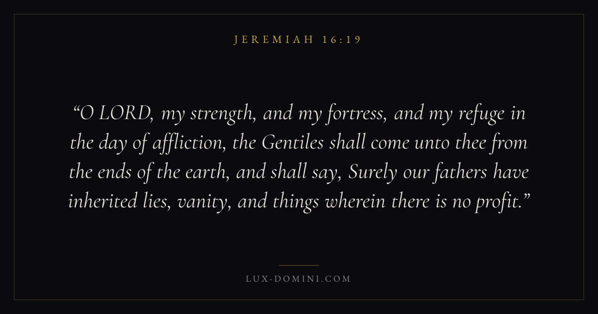 O LORD, my strength, and my fortress, and my refuge in the day of affliction, the Gentiles shall come unto thee from the ends of the earth, and shall say, Surely our fathers have inherited lies, vanity, and things wherein there is no profit.